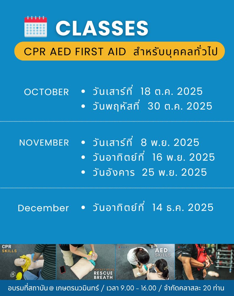 ฝึกการทำ CPR - AED การช่วยผู้ป่วยสำลัก ชัก เป็นลม ห้ามเลือด และการปฐมพยาบาลอาการสำคัญอื่นๆ กระชับทำตามได้ง่าย พร้อมรับ Certificate ในวันอบรม เจ็บป่วยช่วยได้ถูกวิธี และ ที่สำคัญคือต้องไม่ทำให้ผู้ป่วยแย่ลง