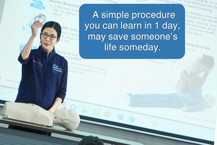American Safety & Health Institute และ BEAT CPR Training Center เรามีความเชี่ยวชาญสูงสุดในการสอนประชาชน : เพื่อให้อย่างน้อยในหนึ่งครอบครัว หนึ่งองค์กร หรือหนึ่งชุมชน มีบุคคลที่มีความรู้ในการปฐมพยาบาลที่ถูกต้องอย่างแท้จริงอย่างน้อยหนึ่งคน เพื่อคนๆนั้นจะสามารถช่วยเหลือตัวเองและคนรอบข้างในวันที่มีเหตุฉุกเฉินเกิดขึ้นได้