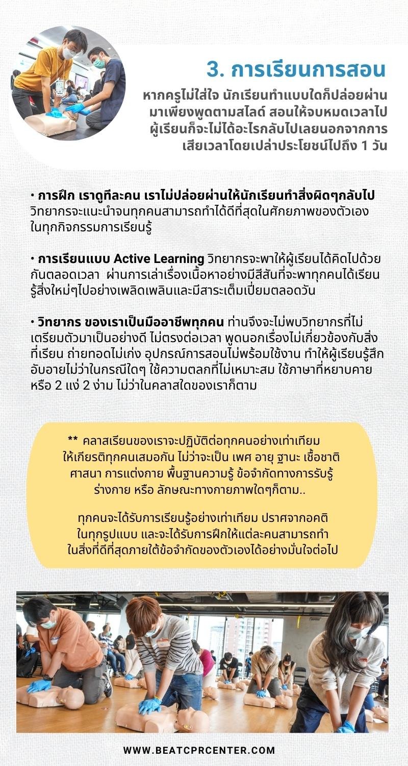 เน้นให้ทุกคนได้ฝึกปฏิบัติอย่างเต็มที่กับหุ่นฝึกที่ทันสมัยสามารถให้ Real-time Feedback ขณะฝึกได้และมีวิทยากรที่ได้รับการรับรองจาก American Heart Association (AHA) คอยให้คำแนะนำตลอดการฝึก